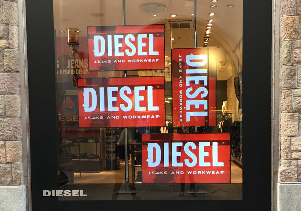 Screens for the Diesel retail store were configured in a mosaic display format, both landscape & portrait. For maximum impact content was synchronised across the screens.